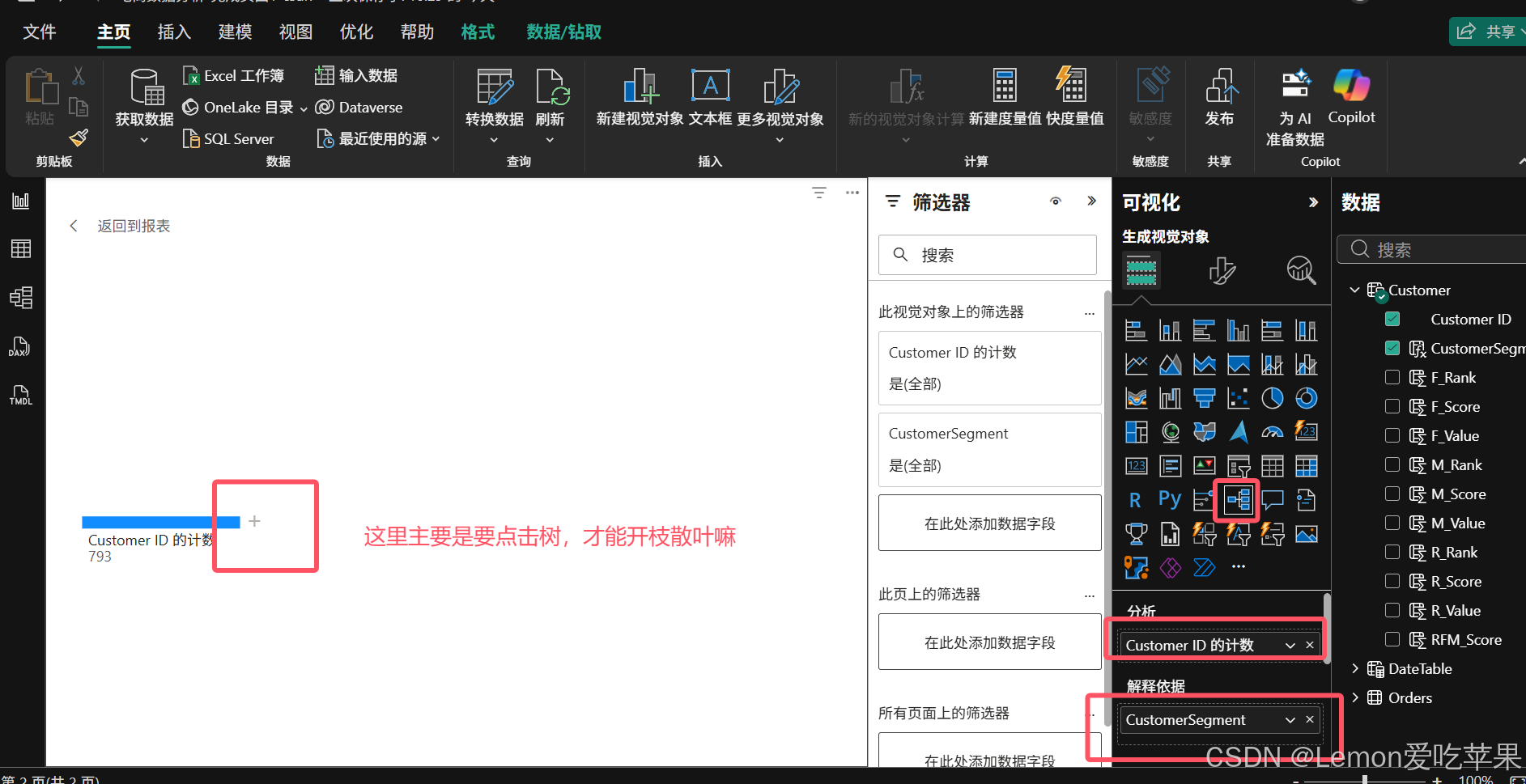 这个分解树就稍稍有一些不同,要注意点击 + 并且选择用 CustomerSegment 展开。