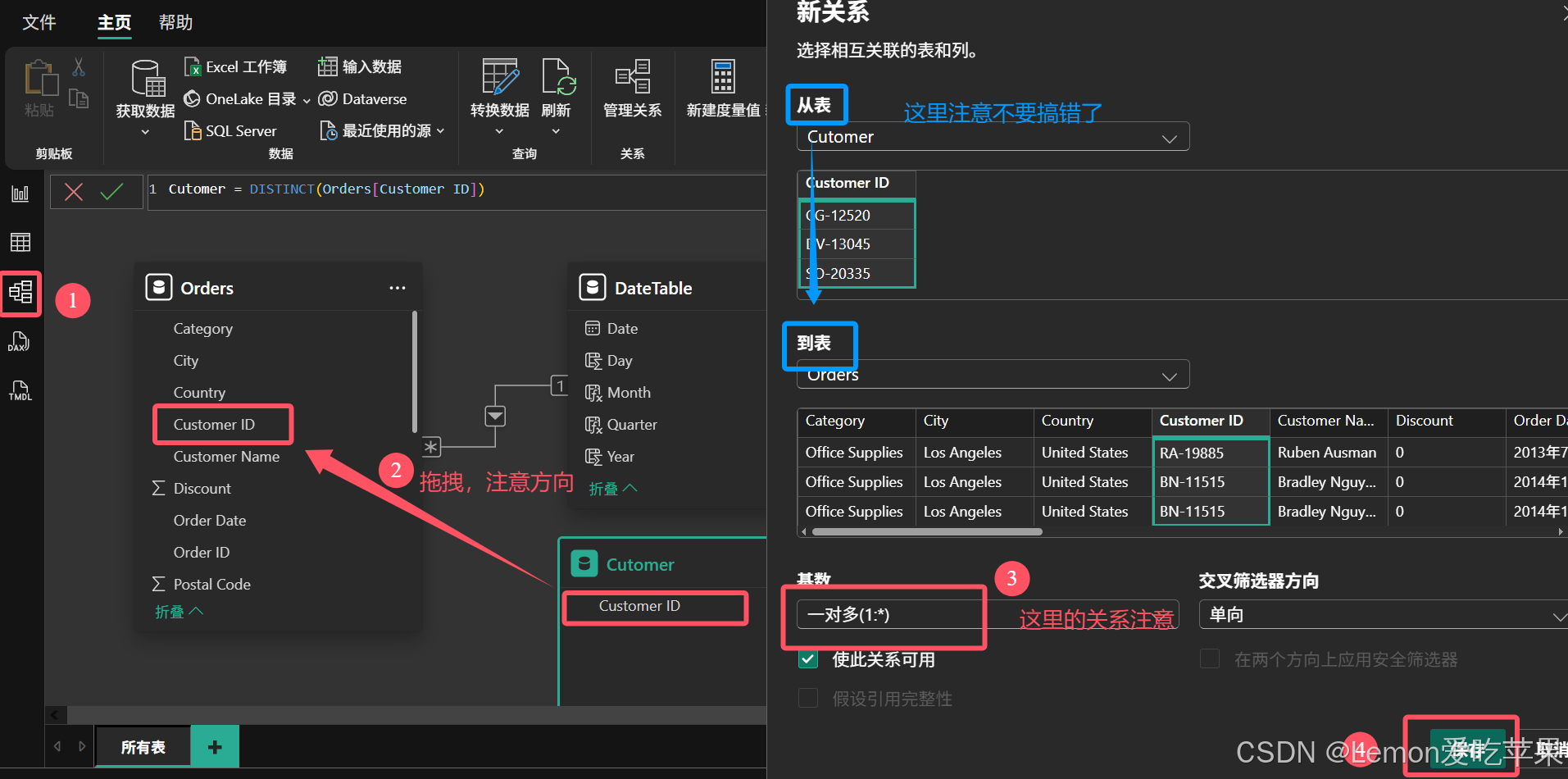 一个 Customer 表中的 Customer ID 对应 Orders 表格中的多个 Orders ID,多个 Orders 表格中的 Orders ID 对应 Customer 表中的一个 Customer ID。