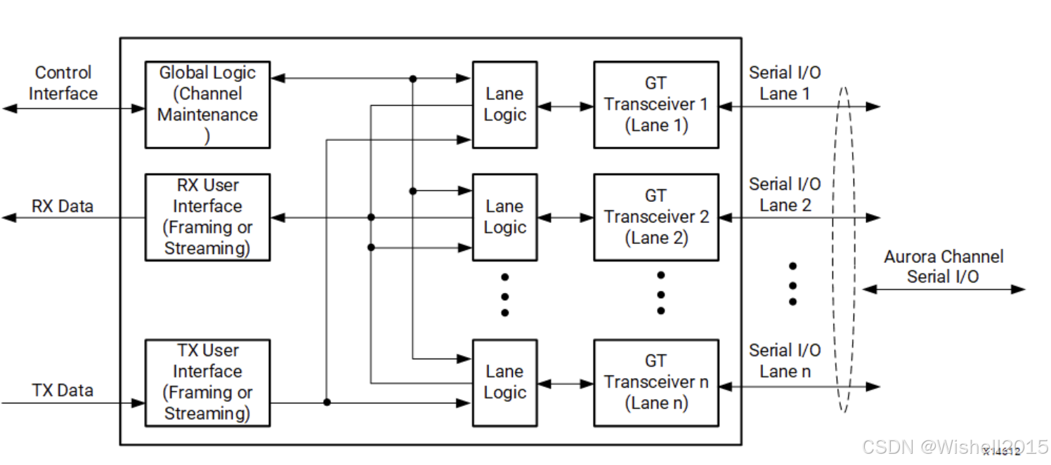Global Logic:全局逻辑模块完成通道初始化的绑定与验证阶段。在运行期间,该模块生成Aurora协议所需的随机空闲字符,并监控所有通道逻辑模块是否出现错误。