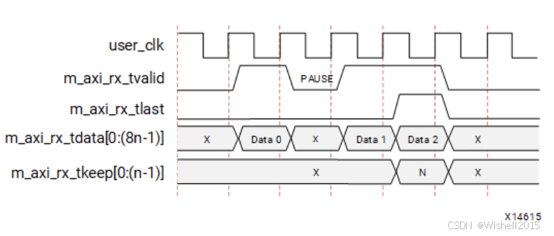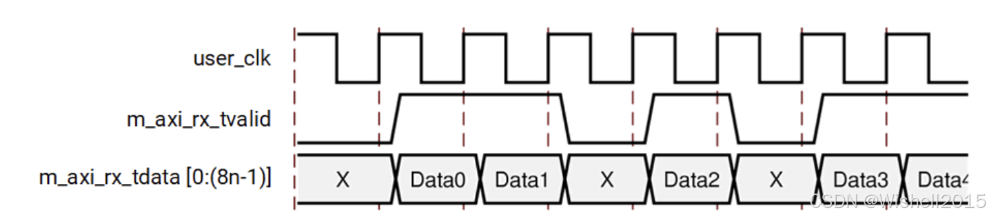 时钟周期 2 & 3 :m_axi_rx_tvalid 拉高(置 1),先后输出 Data0 和 Data1。必须在这两个周期将数据存下来。