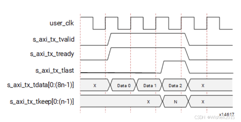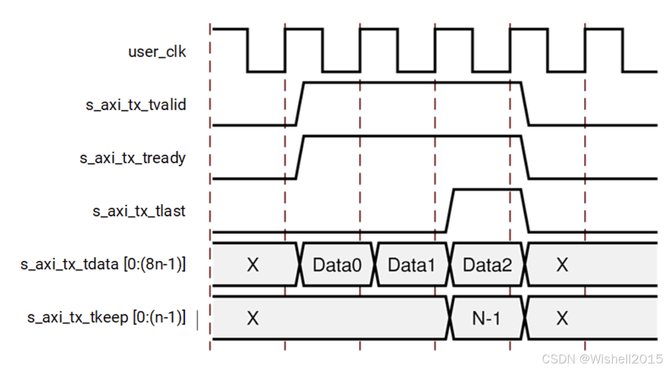 s_axi_tx_tlast,同时给出最后的数据字节,并在s_axi_tx_tkeep上给出有效字节掩码。本例波形中s_axi_tx_tkeep设为 N,表示最后一拍全部字节有效。 - 当