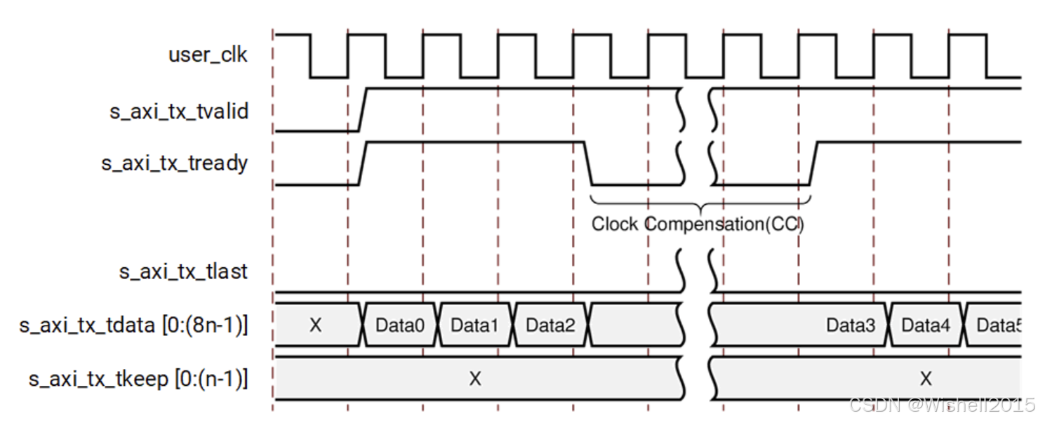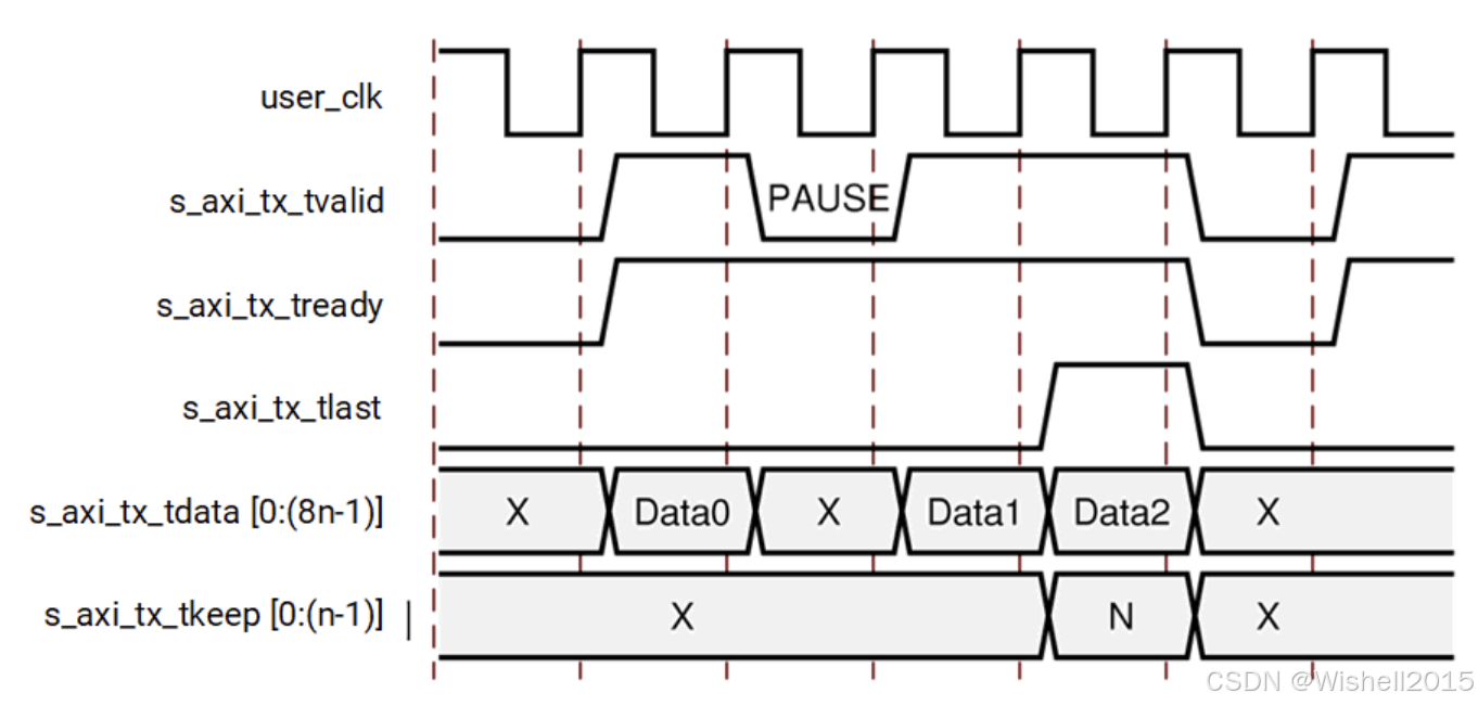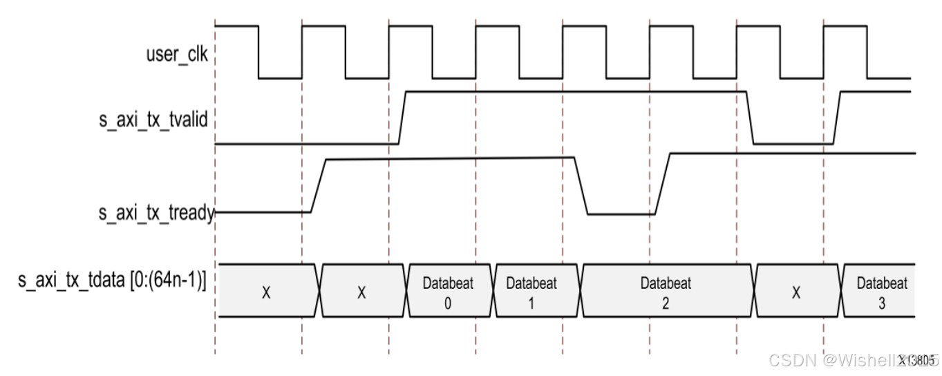s_axi_tx_tvalid信号来发送数据。用户应用可随时拉低s_axi_tx_tvalid,在线路上插入空闲字符(即产生停顿或暂停)。 - 暂停数据(即插入空闲字符)时,