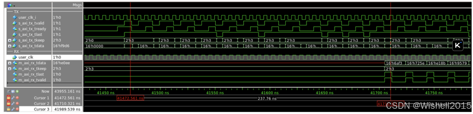 在默认内核配置的功能仿真中,一个双字节成帧设计从 s_axi_tx_tvalid 到 m_axi_rx_tvalid 的最小延迟约为 37 user_clk 个周期(见下图)。