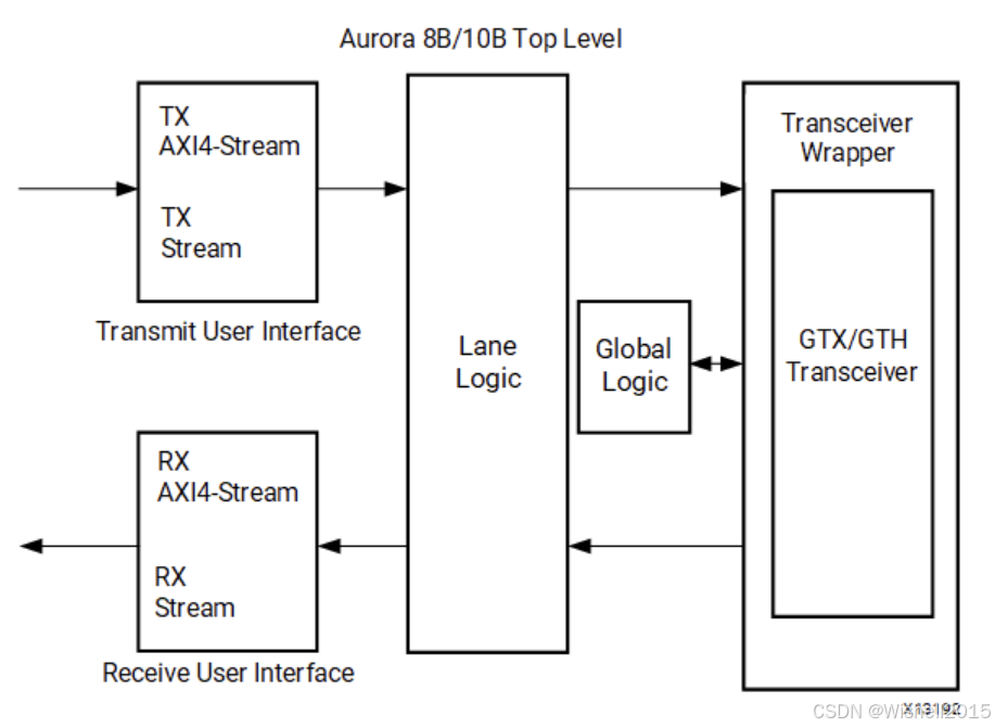 s_axi_tx_tvalid和s_axi_tx_tready信号同时有效时,从用户接口的s_axi_tx_tdata总线上取走数据。 - 将数据按 Aurora 8B/10B 通道的通道条带化(stripe)方式分发到各条 lane。