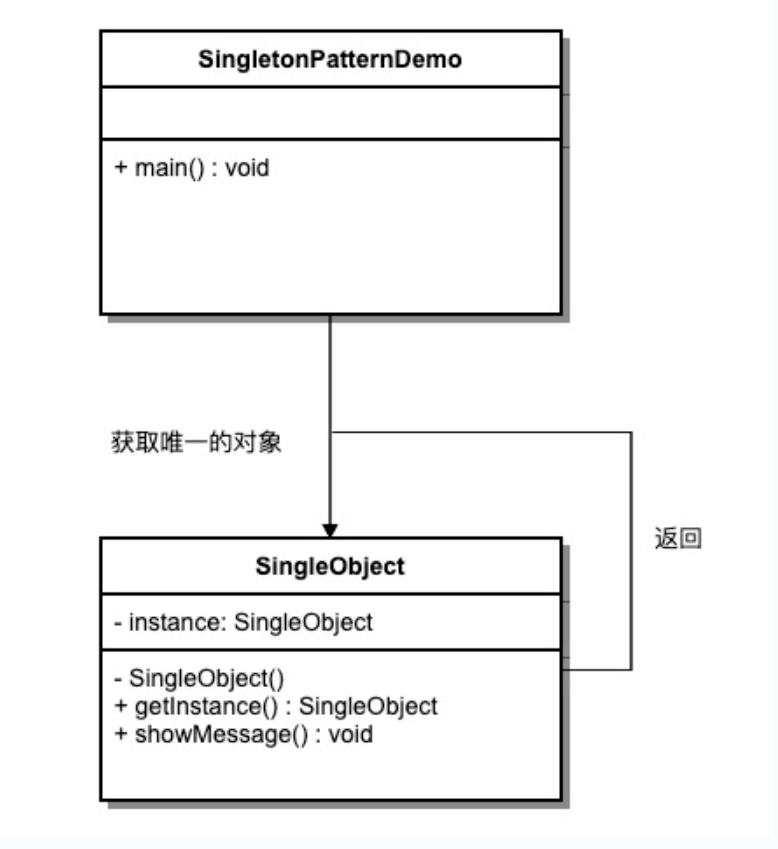 SingleObiect返回唯一的实例instance给SingletonPatternDemo