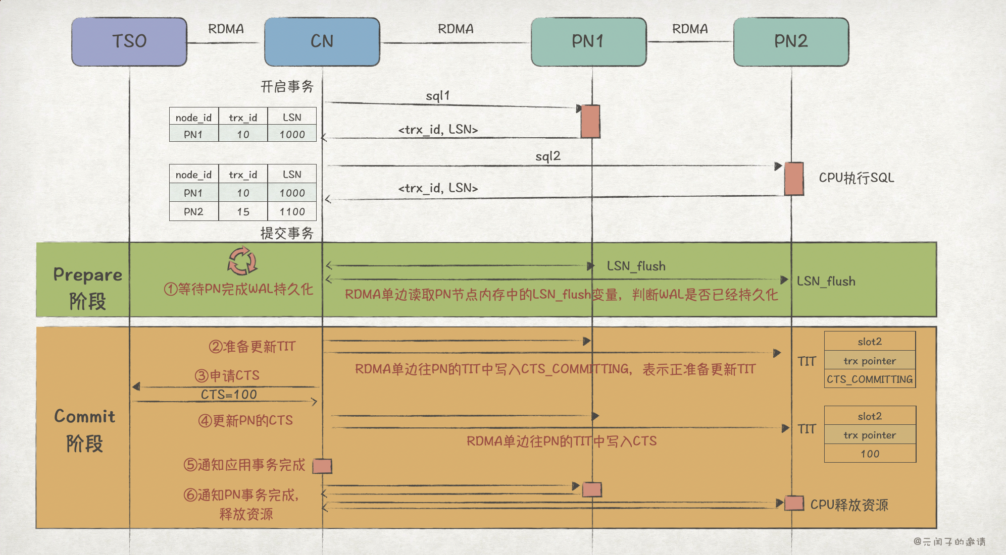 ① Prepare 阶段,Polar2PC 会默认 PN 已经具备提交事务的条件,所以只需等待 PN 完成 WAL 日志持久化后,即可进入 Commit 阶段 。PN 本地内存中 LSN_flush 变量表示当前已持久化的最大 LSN 值,CN 通过单边 RDMA 读取 PN 的 LSN_flush,并与本地保存的 <node_id, trx_id, LSN> 中 LSN 对比。当 LSN_flush > LSN 时,表示 WAL 日志已完成持久化。