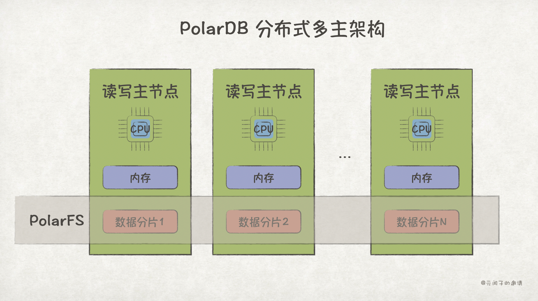 最开始,PolarDB 是单主架构,可以扩展多个只读从节点,但只能有一个读写主节点。这能够避免分布式事务,极大简化系统架构。