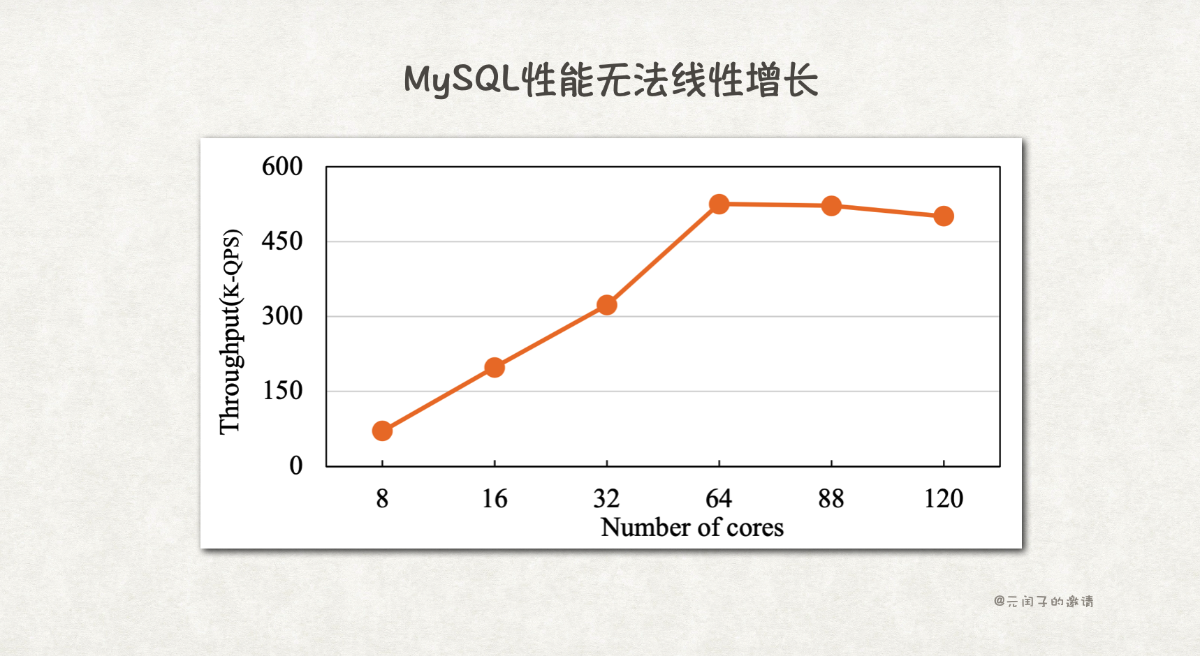 而且,更多的核也并不意味着更高的性能,传统数据库的 B+ Tree、MVCC 等机制实现,并发冲突严重,限制了性能的线性增长。比如 MySQL 在扩展至 64 核后,性能不升反降。