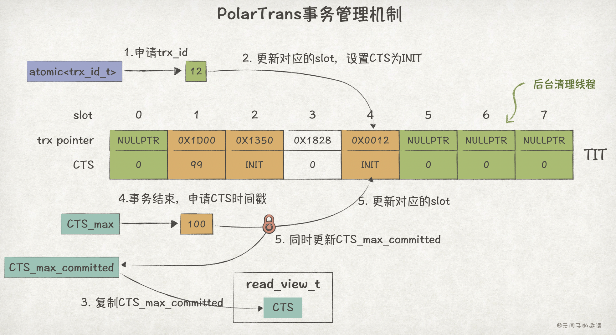 rw_trx_ids数组,仅需拷贝CTS_max_committed变量即可。 - 使用后台清理线程释放事务资源,避免事务提交后仍需遍历
