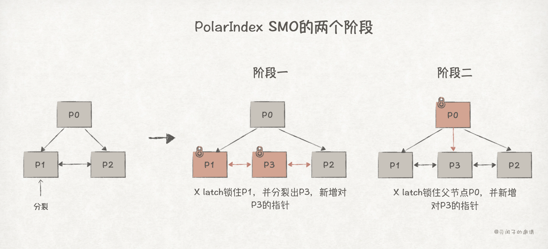 其次,PolarIndex 将一个 page 的 SMO 过程拆分成两个阶段,以 P1 分裂为例: