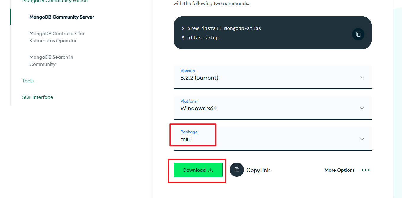 https://www.mongodb.com/try/download/community - 滑到最下面,找到下载的地方,选择"msi",点击"Download"