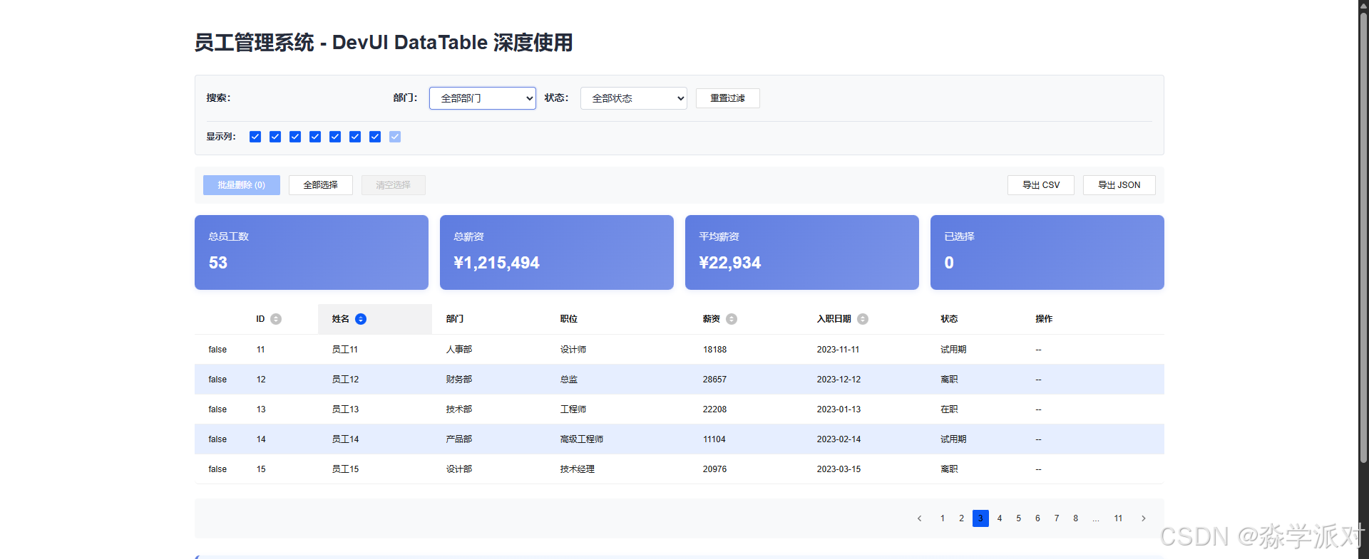 说明 :在 ngOnInit 中初始化数据。生成 53 条测试数据,包括各种部门、职位和状态。设置每 10 条数据中的第一条为禁用状态,用于测试禁用行的处理。