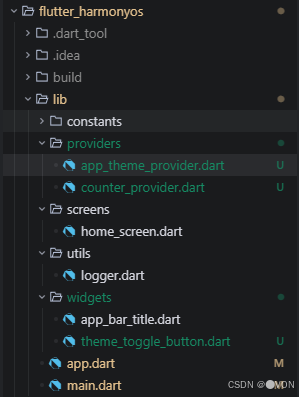 lib/main.dartlib/app.dartlib/constants/app_colors.dart(可选)lib/providers/app_theme_provider.dartlib/providers/counter_provider.dartlib/screens/home_screen.dartlib/widgets/app_bar_title.dartlib/widgets/theme_toggle_button.dartlib/utils/logger.dart(可留空)