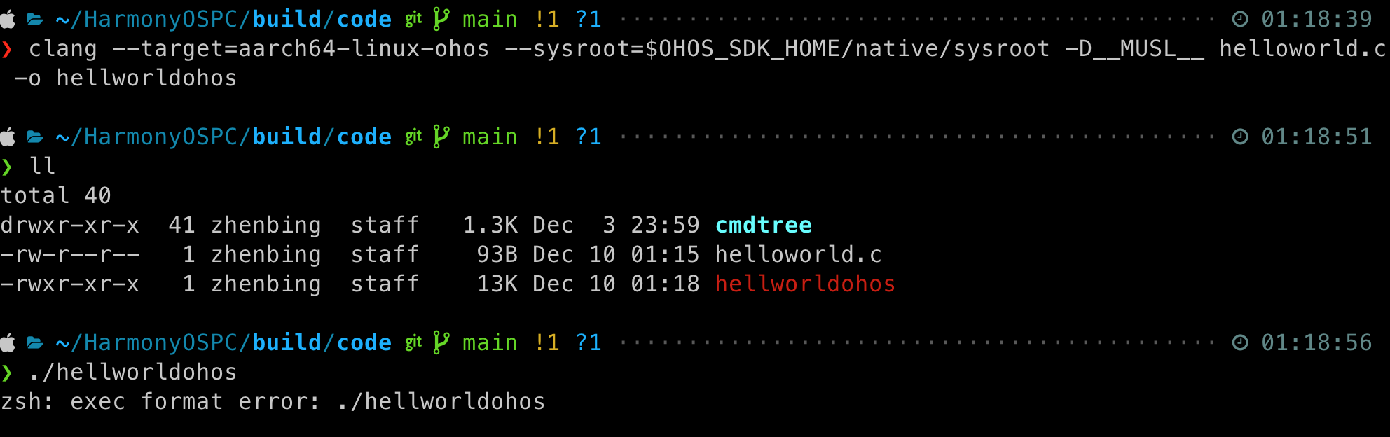 交叉编译一下(target参数意思明确,sysroot参数告诉编译器去哪里找鸿蒙的头文件和库,