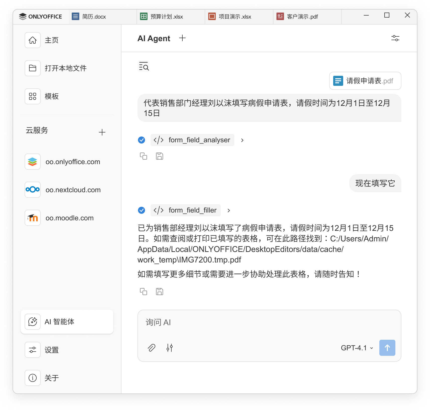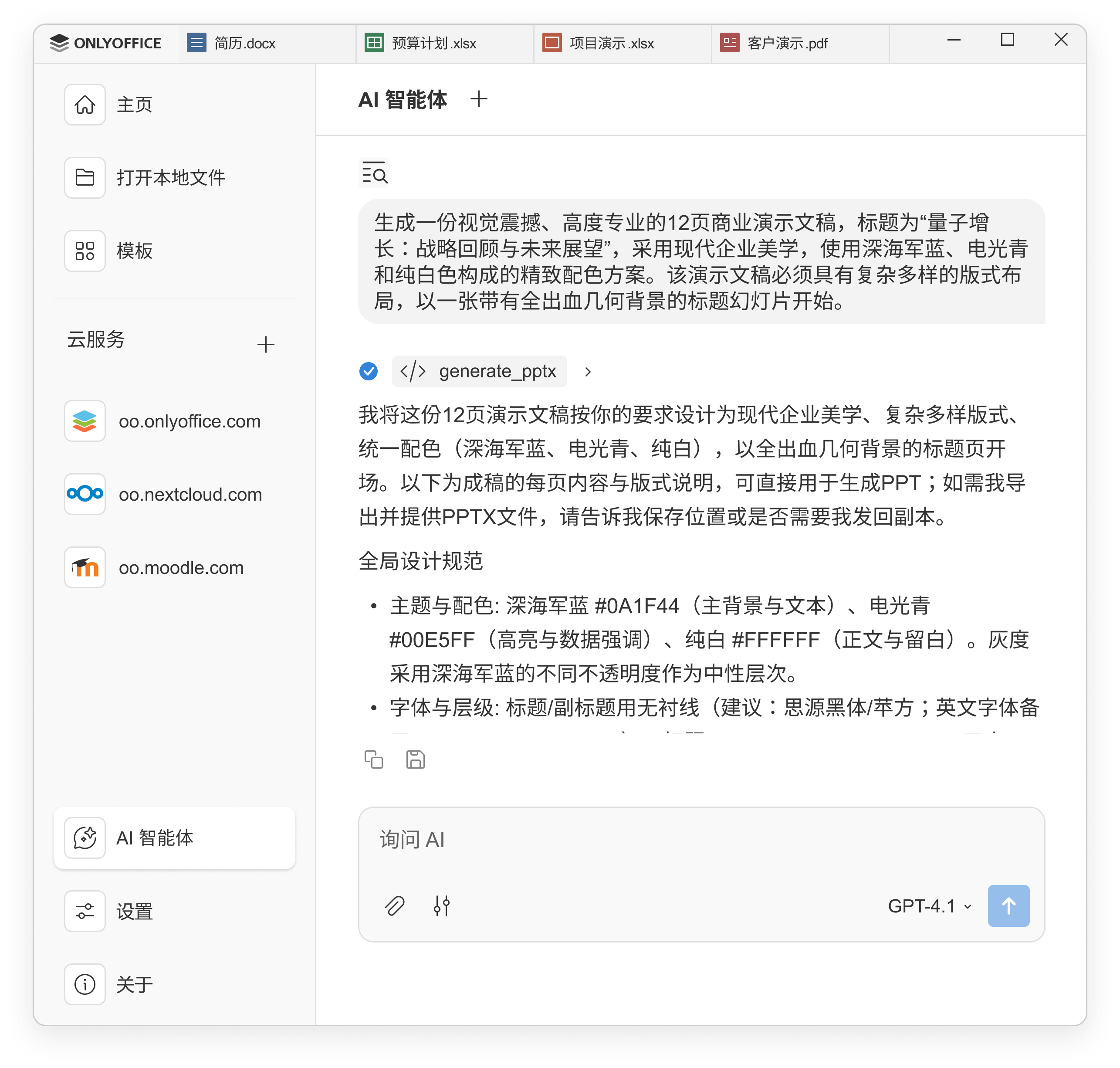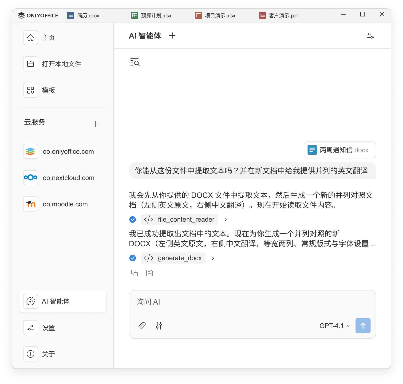 在 ONLYOFFICE 协作空间中,AI 智能体是内置于编辑器中的智能助手,其核心能力在于可以通过理解用户意图、调用工具链并执行复杂操作,实现"类人化"的任务闭环。简单来说,它就像是嵌入在文档编辑器里的一位全能助理,只需告诉它"做什么",它便能自主思考"怎么做"。