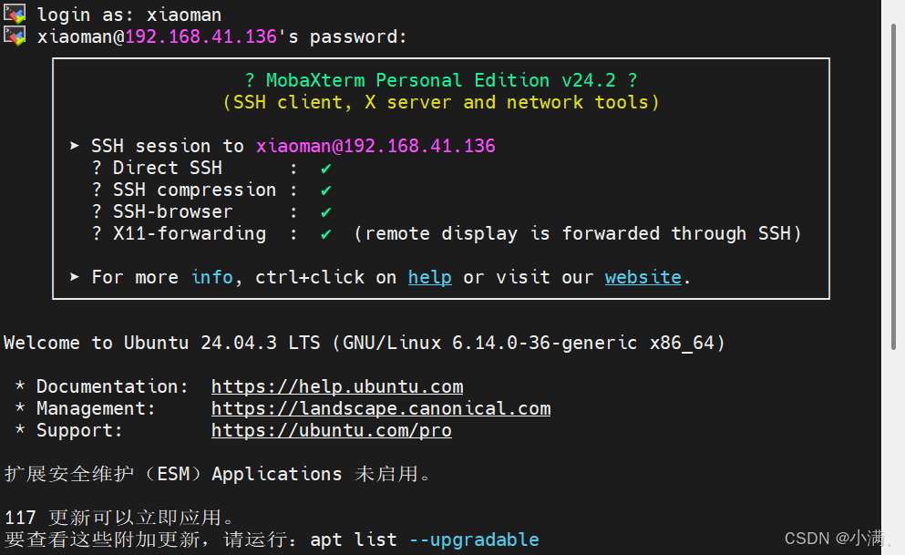 确保 Ubuntu 能被 MobaXterm 正常 SSH 登录。