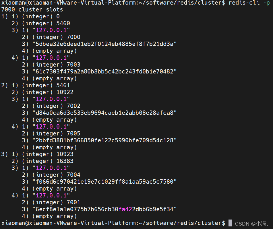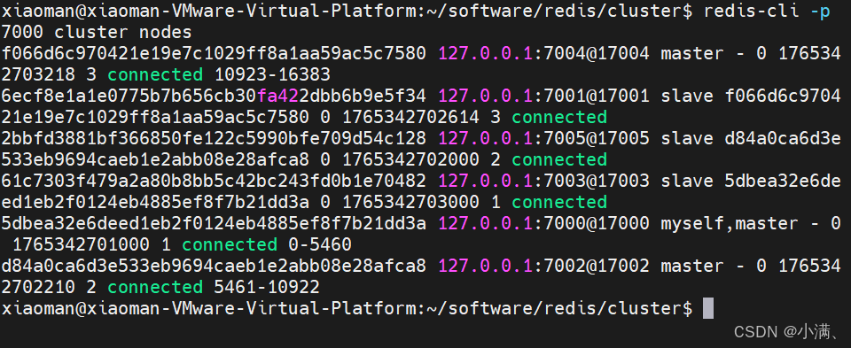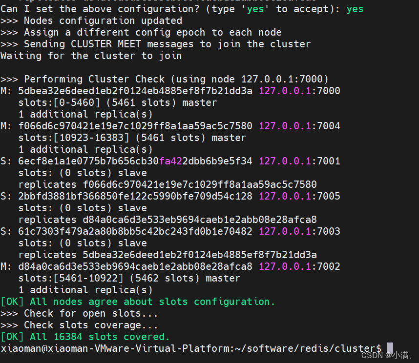 会看到 3 个 master 分别分到 0--5460,5461--10922,10923--16383。