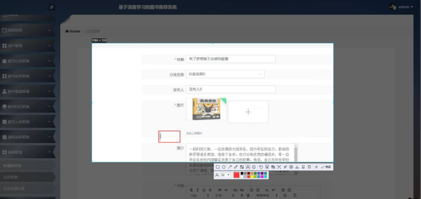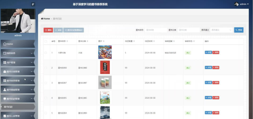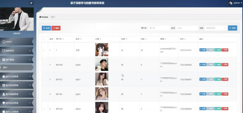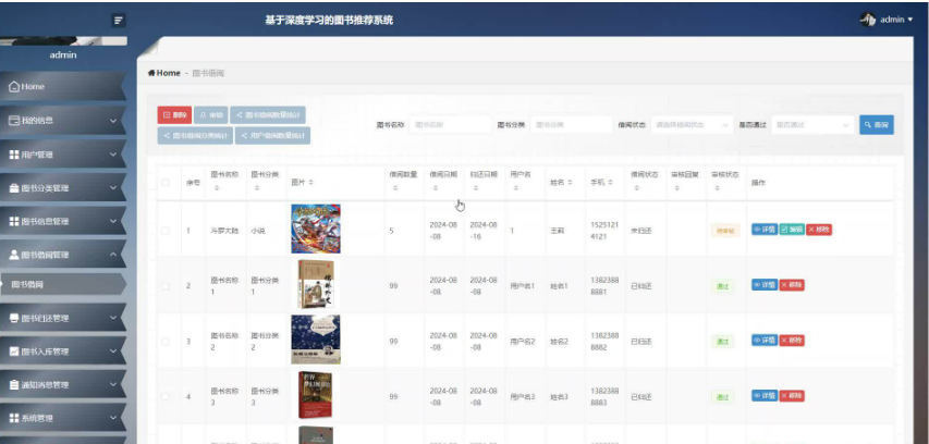 推荐算法模块:该模块是系统的核心部分,采用深度学习算法为用户提供个性化的图书推荐服务。系统会根据用户的历史阅读记录、兴趣爱好等信息,结合深度学习算法对图书内容和用户行为进行深度挖掘和分析,为用户推荐符合其兴趣的图书。同时,系统还支持多种推荐策略的组合和优化,以提高推荐的准确性和多样性。