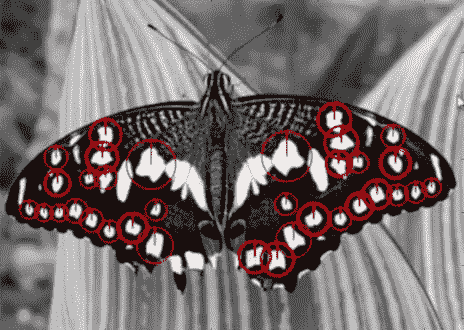 你可以看到 SURF 更像是斑点检测器。它检测到蝴蝶翅膀上的白色斑点