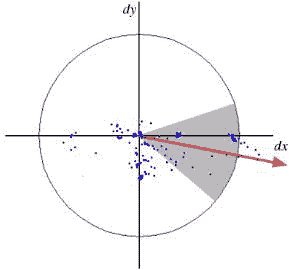 对于主方向,在 SURF 中是对以特征点为中心的 6s(s 为特征点的尺度)为半径的圆形区域内的图像进行 Haar 小波响应运算得到的。使用高斯函数对小波响应进行加权。然后将它们绘制在下图中给出的图像中。通过计算角度为 60 度的定向滑动窗口内的所有响应的总和来估算主方向。有趣的是,任意尺度空间上的小波响应都可以很容易地使用积分图像找到。对于许多应用,不需要旋转不变性,因此无需找到此方向,从而加快了过程。 SURF 提供被称为 Upright-SURF 或 U-SURF 的功能。(其实很简单,SURF是通过削减方向判断从而加快了速度)