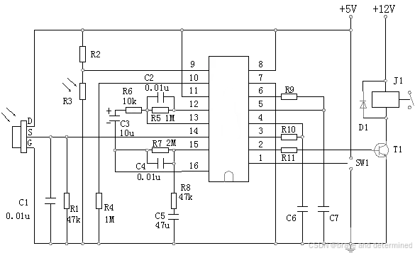 信号拾取与放大:热释电传感器输出的微弱电荷信号,经由芯片内部的第一级运放(OP1)和第二级运放(OP2)进行两级放大,并将信号直流电位抬升至合适的工作电平。