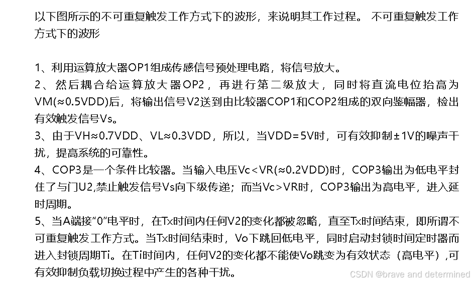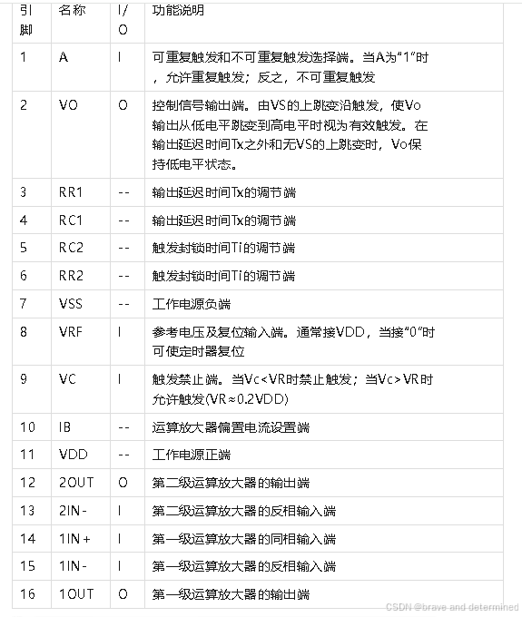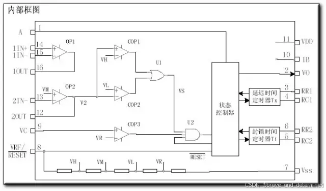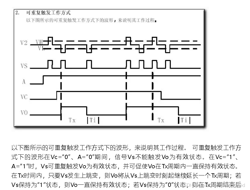 逻辑控制与延时 :有效触发信号在满足条件比较器(COP3)等控制逻辑后,触发延迟时间定时器,产生一个高电平输出信号(Vo)。这个输出信号的持续时间(Tx)和两次触发之间的最小间隔(封锁时间Ti)都可以通过外接的电阻和电容进行调节。通过设置芯片的A引脚电平,还可选择不可重复触发 (Tx时间内忽略新信号)或可重复触发(Tx时间内新信号可重置延时)两种工作模式,以适应不同场景需求。