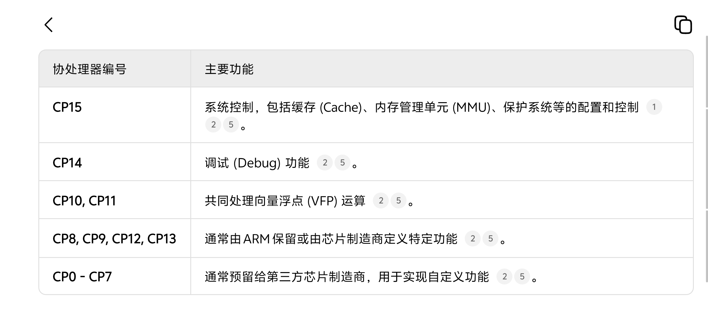 ARM 架构支持最多 16 个协处理器,编号为 CP0 到 CP15 。每个协处理器只执行针对自身的协处理指令 。