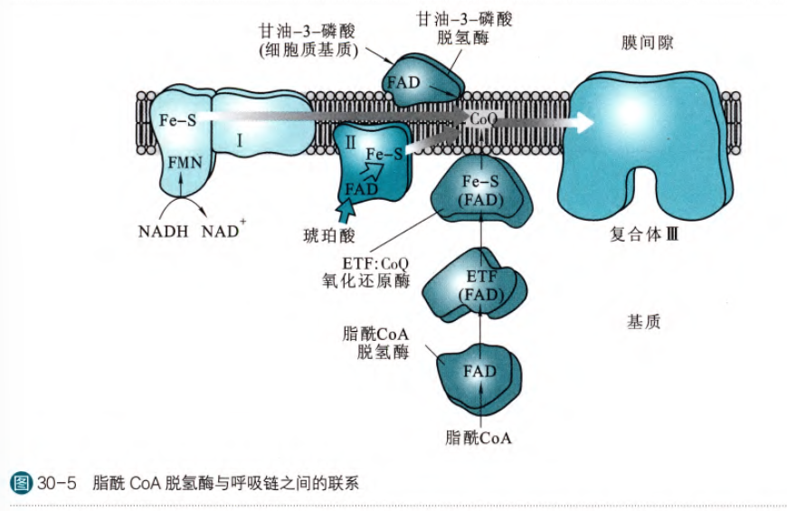 这一步是由脂酰CoA脱氢酶催化的,此脱氢酶依赖FAD,FADH2将电子通过电子传递黄素蛋白,传递给铁硫蛋白然后最后传递给辅酶Q,然后从复合体III进入呼吸链。所以这里的FADH2不通过复合体II进入呼吸链,而是直接从复合体III进入,所以这一步会生成1.5ATP
