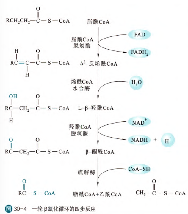 其实β氧化的历程有点类似柠檬酸脱氢转变为顺乌头酸然后水合变为异柠檬酸最后异柠檬酸脱羧,这里β氧化也基本上遵循着活化(转变为脂酰辅酶A),脱氢,水合,裂解的过程