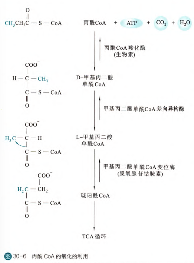 我们之前一直是以软脂酸为例,但是如果我们分解的是奇数脂肪酸呢?实际上在前面的反应当中都是正常进行活化和β-氧化的,只是在最后的β碳上我们发现实际上连接了最末端的甲基,这种情况其实就已经到达反应的终点,最后生成丙酰CoA。但是其实我们在糖异生当中提到过丙酰CoA,这是糖异生的原料,那丙酰CoA经过了什么反应加入到糖异生中呢?实则是经过羧化和异构反应,最后转变为琥珀酰CoA,从而既可以参加三羧酸循环,也可以转变到草酰乙酸之后离开线粒体,参与糖异生途径。下面是丙酰CoA转变为琥珀酰CoA的历程。简单来说就是先羧化(催化这一步反应的酶需要生物素作为辅基,同时也需要消耗一分子的ATP,类似于糖异生途径中丙酮酸的羧化),然后差向异构,之后再将羧基变位,得到琥珀酰辅酶A。