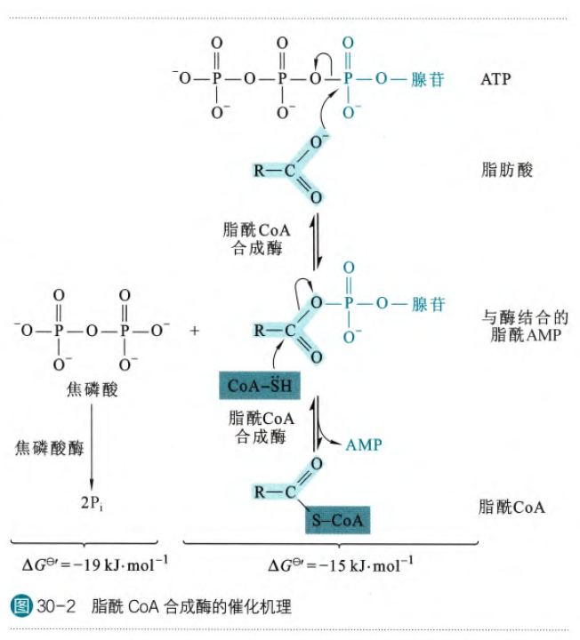 脂肪酸在脂酰辅酶A合成酶的作用下消耗一个ATP生成脂酰辅酶A。这里可以理解为为脂肪酸首先加上了AMP,然后生成了一个焦磷酸(焦磷酸极易水解生成两个磷酸基团,这一步会释放较多自由能),然后辅酶A替代AMP生成了脂酰辅酶A。