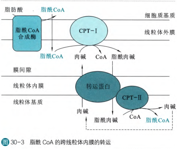 但是脂酰CoA不可以直接通过线粒体内膜,主要的限制因素在CoA上,CoA是一个强极性的基团,这里需要借助三个重要的蛋白分别是肉碱-软脂酰转移酶I(CPTI)和肉碱-软脂酰转移酶II(CPTII)和脂酰肉碱转位酶(CACT)
