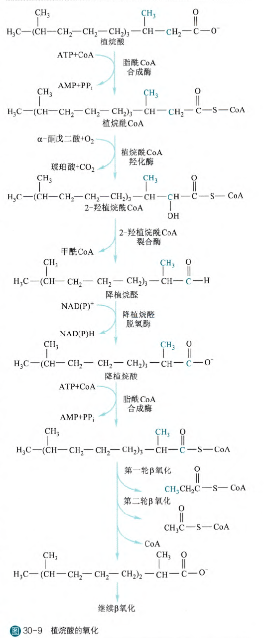 得到植烷酰CoA之后首先植烷酰羟化酶在α碳上加上一个羟基(这一步需要α-酮戊二酸和氧气的参与),然后直接在裂合酶的作用下直接分裂得到甲酰CoA和降植烷醛,之后在脱氢酶的作用下氧化生成降植烷酸,之后降植烷酸还是需要经历新一轮活化再参与反应。