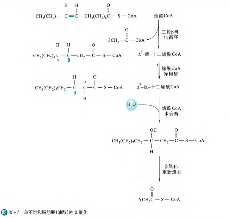 如果不饱和脂肪酸的双键恰好是在反式也是正确的位点,那么实际上也就是跳过了最开始的脱氢步骤,仅仅是少了1.5个ATP,不会干扰后面的反应。但是我们摄入的不饱和脂肪酸绝大多数都是顺式(自然界的都是),所以这样首先需要烯酰CoA异构酶将其变为反式,然后再正常反应(这一步也是跳过了脱氢哈~)