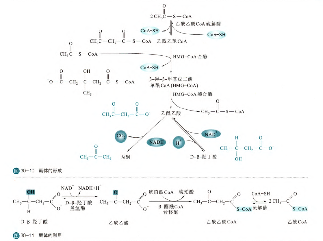 酮体包括丙酮、乙酰乙酸和D-β-羟丁酸。酮体一般是在饥饿、高脂肪低糖饮食等情况下会大量合成,因为在这些情况中,血糖的降低使得需要在三羧酸循环里面抽调代谢物进行糖异生,这样会使得TCA的运转速度变慢,乙酰CoA积累,那么积累的乙酰CoA便会参与酮体的合成。酮体主要的合成场所是肝细胞的线粒体基质(毕竟这是糖异生的主要细胞),肾脏细胞和神经胶质细胞也可以合成少量酮体。