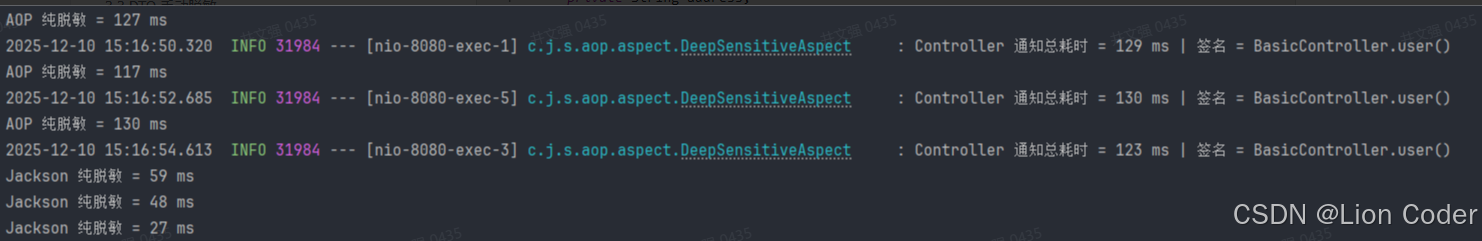 java@Target(ElementType.FIELD) @Retention(RetentionPolicy.RUNTIME) public @interface Sensitive { SensitiveType value(); }java/** * 脱敏类型枚举 */ public enum SensitiveType { PHONE, // 手机号 ID_CARD, // 身份证 NAME, // 姓名 EMAIL, // 邮箱 BANK_CARD // 银行卡 }java/** * 深度脱敏AOP处理器 */ @Aspect @Component @Slf4j public class DeepSensitiveAspect { // 定义切点:拦截Controller层所有方法 @Pointcut("execution(* com.jing.springbootdemo.web.BasicController.user())") public void controllerPointcut() {} /** * 环绕通知:处理Controller层返回结果 */ @Around("controllerPointcut()") public Object aroundController(ProceedingJoinPoint joinPoint) throws Throwable { Object result = joinPoint.proceed(); long start = System.nanoTime(); Object res = processDeepSensitive(result); long end = System.nanoTime(); long cost = TimeUnit.NANOSECONDS.toMillis(end - start); log.info("Controller 通知总耗时 = {} ms | 签名 = {}", cost, joinPoint.getSignature().toShortString()); return res; } /** * 递归处理单个对象所有字段 */ private Object processObject(Object obj) { if (obj == null) { return null; } Class<?> clazz = obj.getClass(); try { // 获取所有字段(包括父类) List<Field> fields = getAllFields(clazz); for (Field field : fields) { field.setAccessible(true); // 检查是否有脱敏注解 Sensitive sensitive = field.getAnnotation(Sensitive.class); if (sensitive != null && field.getType() == String.class) { // 处理敏感字段 processSensitiveField(obj, field, sensitive); } else { // 递归处理嵌套对象 processNestedField(obj, field); } } } catch (Exception e) { log.warn("脱敏处理失败: {}", e.getMessage()); } return obj; } }