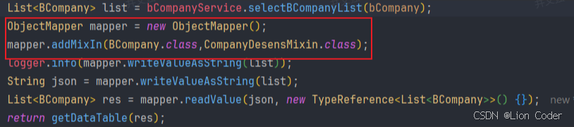 addMixIn++*的本质是:把"Mixin 接口/类"上的所有注解,原封不动地嫁接给目标实体类,但运行时仍然只出现目标实体类BCompany,Mixin 本身不会被实例化也不会出现在 JSON 里。