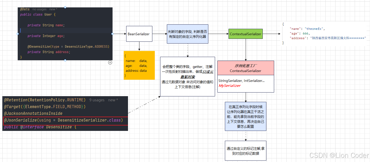 JsonSerializer<String>+ContextualSerializer);在需要脱敏的字段上只加业务注解(如