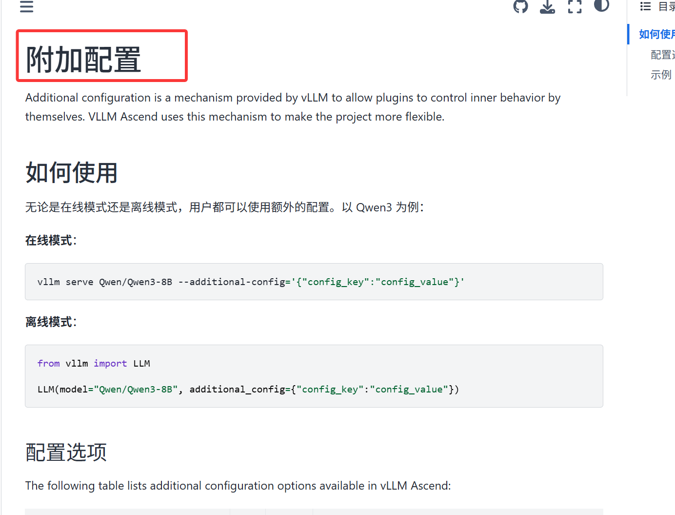 vLLM 提供的附加配置(Additional Configuration) 机制,允许插件自主控制内部行为,vLLM Ascend 借助该机制提升了项目的灵活性。无论是在线服务模式还是离线调用模式,用户都可通过指定 additional_config 参数配置相关选项,适配不同模型(如 MoE 模型、DeepSeek 系列模型等)和业务场景(如推理性能优化、负载均衡、缓存量化等)。