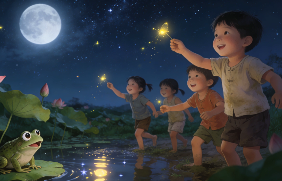 画面转向更鲜活的童年乐事,"月移柳岸"点明星月相伴的环境,"萤光舞"增添夜色的灵动;"露湿青衫"细节生动,写出孩童专注钓蛙虫时,被夜露打湿衣衫也浑然不觉的投入,满是无忧无虑的野趣。