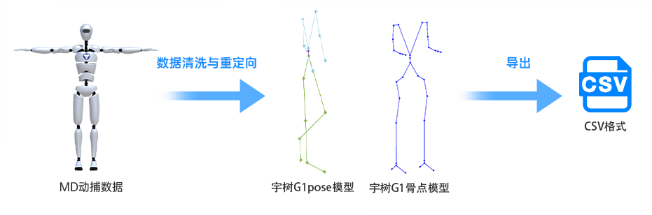 支持MD格式动捕数据无缝加载与预览,实现与宇树G1动作系统的跨格式兼容;