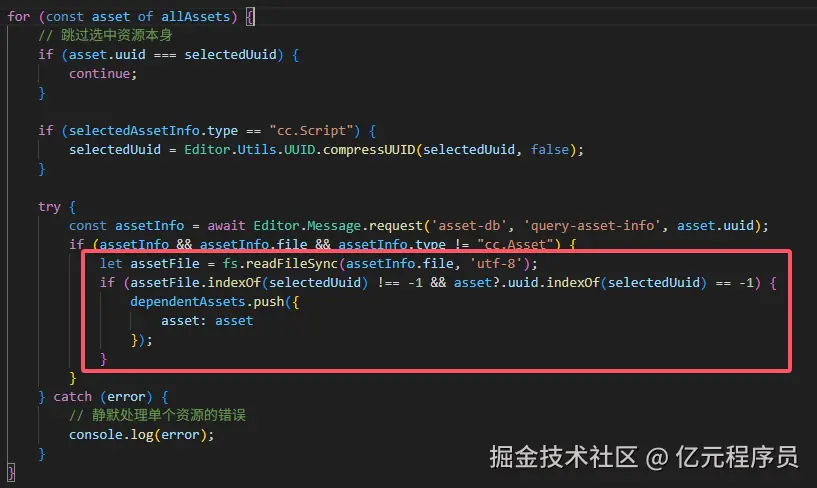 let assetFile = fs.readFileSync(assetInfo.file, 'utf-8');通过fs模块读取文件内容然后判断是否包含选中资源的uuid。