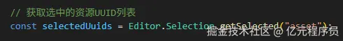 const selectedUuids = Editor.Selection.getSelected("asset");