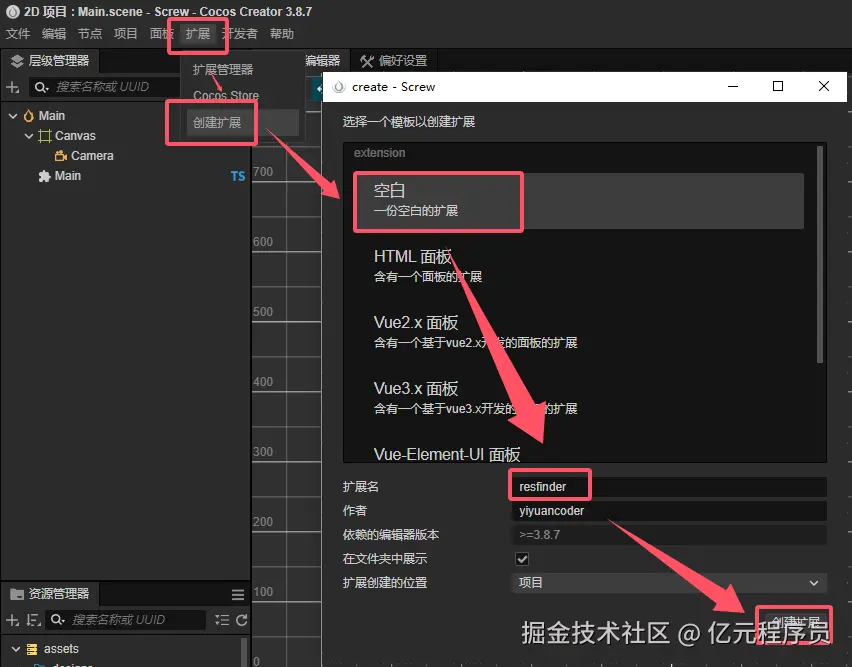 想要自定义插件查看资源被什么引用 ,首先要创建我们的插件,通过菜单扩展->创建扩展打开扩展创建面板,选择一个空白模板进行创建并启用插件。