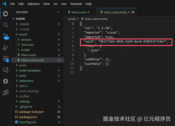 如上图 ,Main.scene的uuid,或者是在下图的Main.scene.meta文件中: