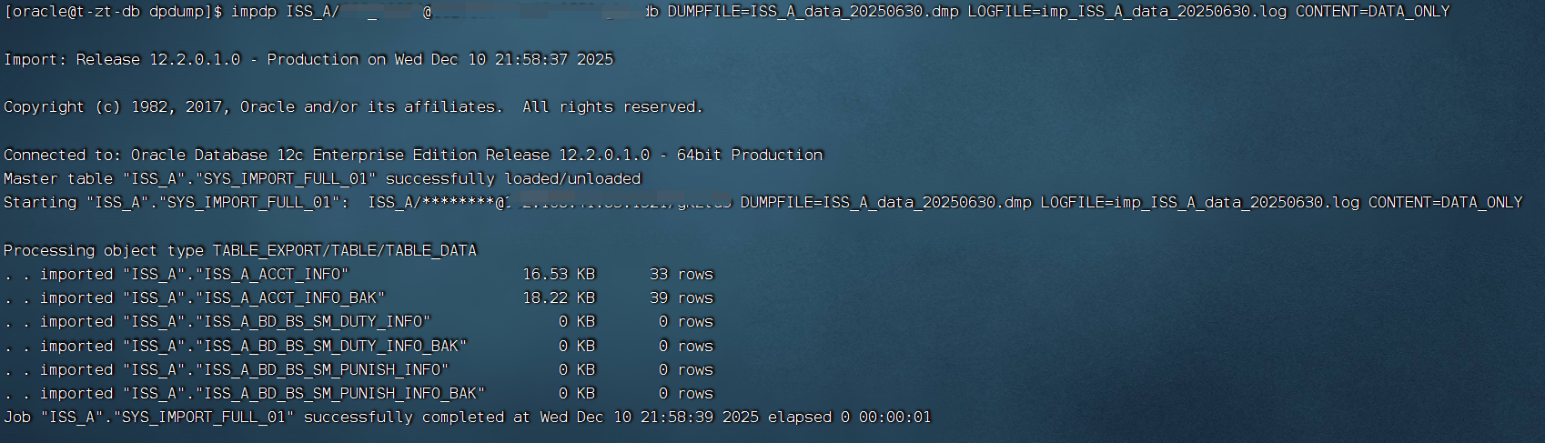 impdp ISS_A/123456@127.0.0.1:1521/testdb DUMPFILE=ISS_A_data_20250630.dmp LOGFILE=imp_ISS_A_data_20250630.log CONTENT=DATA_ONLY