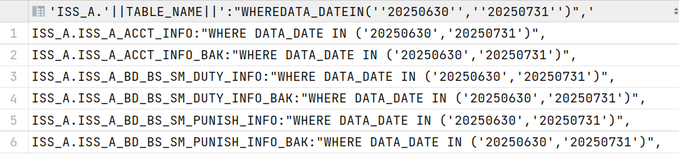 SELECT 'ISS_A.' || table_name || ':"WHERE DATA_DATE IN (''20250630'',''20250731'')",'