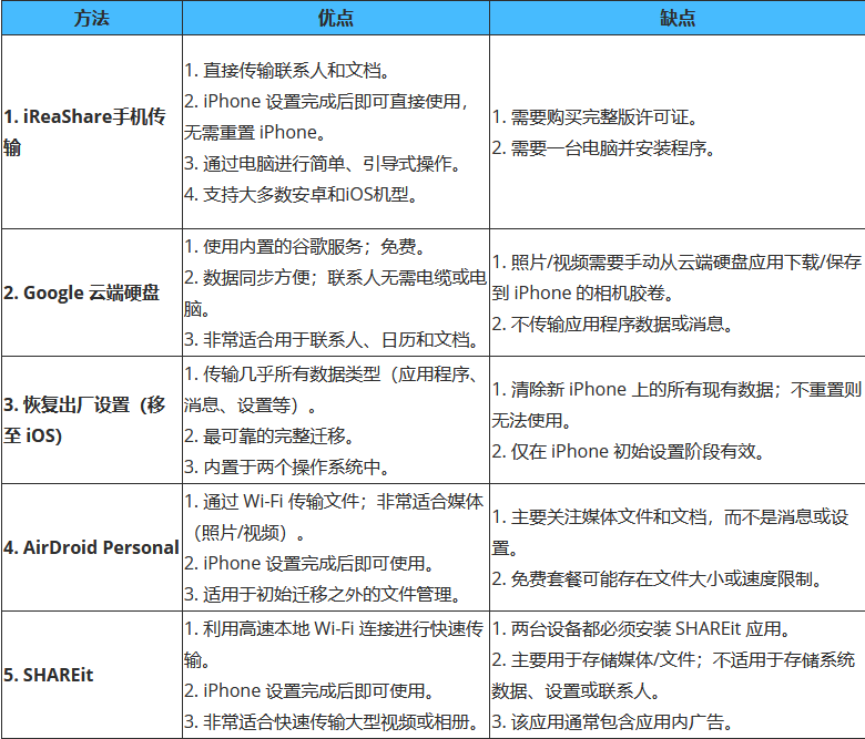 即使完成初始设置后,您仍然可以通过多种方式将 Android 手机中的数据传输到 iPhone。您还可以使用 Google Drive、AirDroid 和 SHAREit。如果 iPhone 上没有重要文件,您可以重置 iPhone,然后使用"转移到 iOS"功能传输数据。