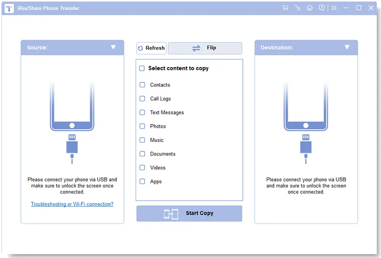 下载 iReaShare 手机传输软件后,将其安装到电脑上。然后启动软件,并使用 USB 数据线将两部手机连接到电脑。