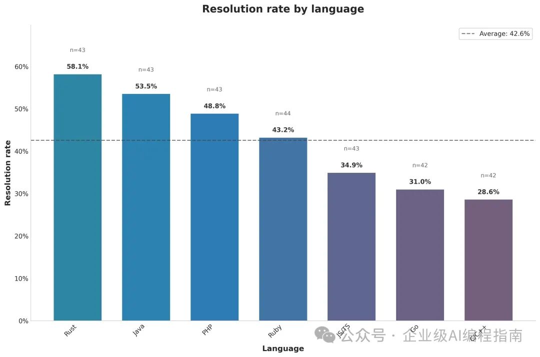 尽管 AI 发展一日千里,但是,它不是万能的,上图是 SWE-bench Multilingual 在不同语言的解决率,很容易发现 Rust、Java、Python的效果要显著好于C/C++。同样,即使是 Java 语言的功能,在实现不同功能时,AI的效果也是不同的。